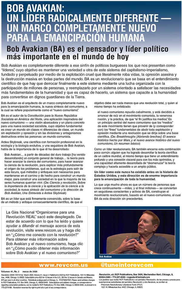 Bob Avakian es completamente diferente a ese sinfín de políticos burgueses los que nos presentan como “líderes”, cuyo objetivo es mantener una variedad u otra de este sistema del capitalismo-imperialismo, fundado y perpetuado por medio de la explotación cruel que literalmente roba vidas, la opresión asesina y la destrucción masiva en todas partes del mundo. BA es un revolucionario que se basa en el entendimiento científico de que hay que derrocar finalmente a este sistema mediante una lucha organizada con la participación de millones de personas, y reemplazarlo por un sistema orientado a satisfacer las necesidades más fundamentales de la humanidad y que es capaz de hacerlo, un sistema que capacite a la humanidad para convertirse en dignos guardianes de la Tierra.
