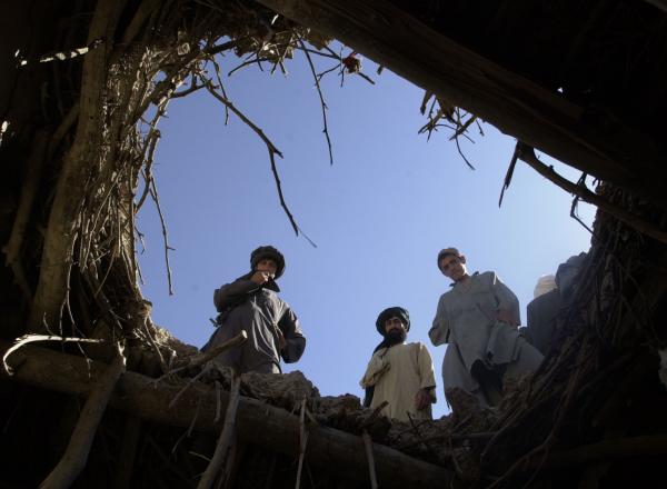 Los aldeanos afganos se paran cerca de un agujero en el techo de una casa en Kakarak, Afganistán, 3 de julio de 2002, después de que fuera alcanzada por una bomba estadounidense. Murieron veinticinco personas que celebraban una fiesta de bodas en la casa. Entre 2004 y 2018, Estados Unidos soltó más de 38.000 bombas sobre Afganistán. Foto: AP