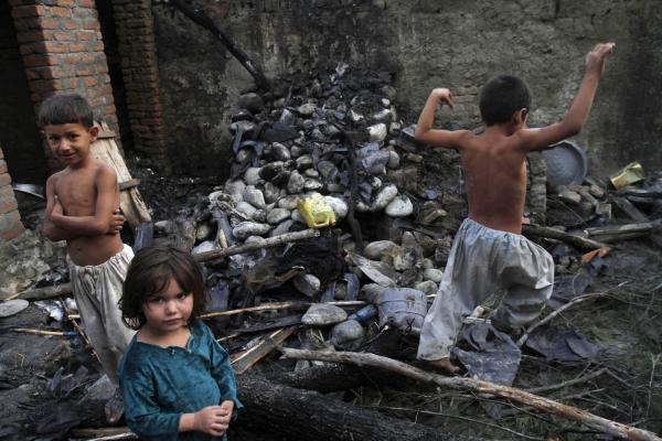 Niños afganos juegan cerca de los escombros de una casa dañada después de que un avión no tripulado estadounidense se estrellara en Jalalabad, al este de Kabul, la capital de Afganistán. Para marzo de 2020, Estados Unidos ya había llevado a cabo más de 12.000 ataques con aviones no tripulados en Afganistán, con un saldo de miles de afganos muertos. Foto: AP