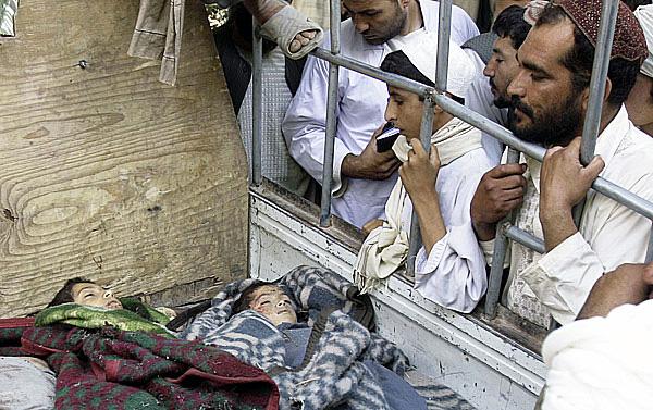 Unos familiares observan a unos niños dejados muertos por un ataque aéreo estadounidense en Kandahar en 2009. Foto: AP