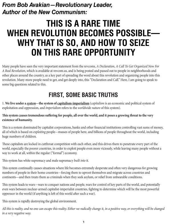 Many people have seen the very important statement from the revcoms, A Declaration, A Call To Get Organized Now For A Real Revolution, which is available at revcom.us, and is being posted and passed out to people in neighborhoods and other places around the country, as a key part of spreading the word about this revolution and organizing people into this revolution. Many more people need to get, and get deeply into, this “Declaration and Call.” Here, I am going to speak to some big questions related to this.