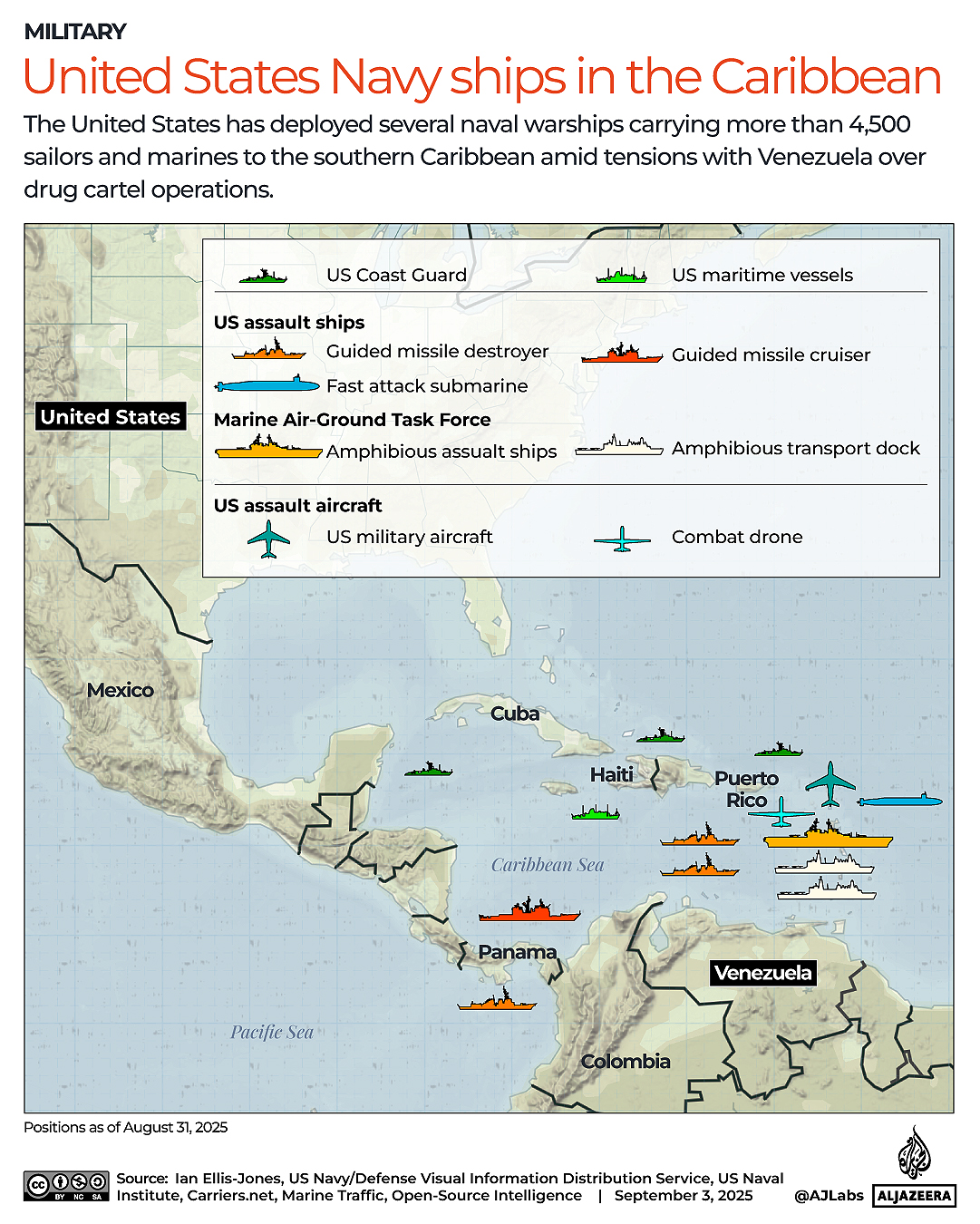 On September 13, Venezuela reported that a Venezuelan tuna boat in that country’s territorial waters was “illegally and hostilely boarded by a United States Navy destroyer” and that 18 armed personnel remained on the vessel for eight hours, preventing communication and the fishermen’s normal activities. They were then released under escort by the Venezuelan navy.