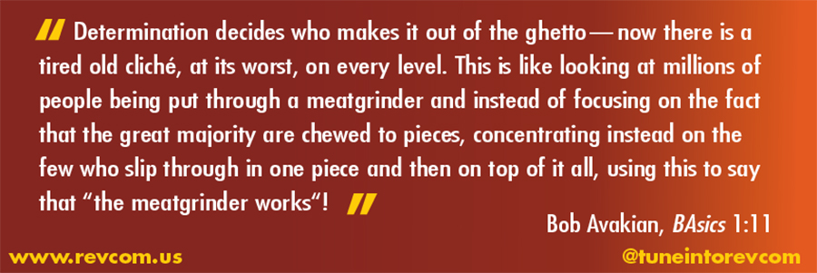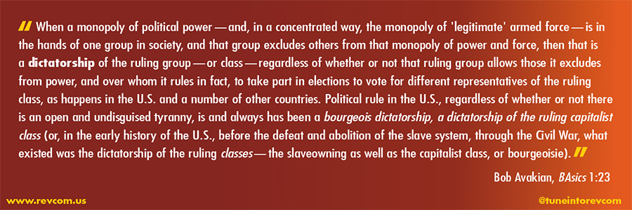 Every week, REVCOM.US features quotes from BAsics, by Bob Avakian, the handbook for revolution. This week we have a set of six quotes, which are available as a slide show as well as on a page where they can be read. We encourage Revolution Clubs and other readers, everywhere, to take the time to discuss the quotes—the whole quotes—and to write us at revolution.reports@yahoo.com with accounts of these discussions, or thoughts provoked in yourself by reading the quotes.