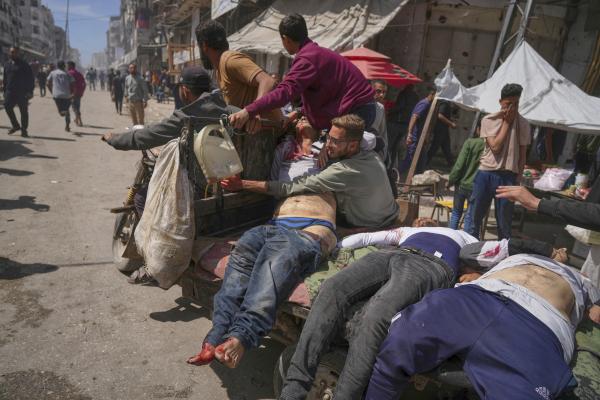 In Gaza City, a truck takes the bodies of some of the 29 victims from an Israeli army strike on a restaurant, May 7, 2025. Photo: AP/Jehad Alshrafi