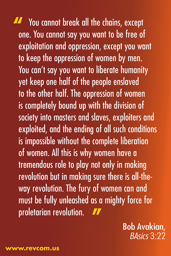 Hundreds of people in different cities—with 350 in New York and at least 200 in Berkeley—mounted the political stage, even as the so-called leaders of the so-called women’s movement did nothing. Prominent voices who have fought against the oppression of women for years and even decades—including V (formerly known as Eve Ensler) who gave a powerful speech in New York, and Gloria Steinem, who sent a message of support, as well as some others—went against the tide of capitulation and lent their voices to this new effort. There was a strong presence of Latina women, particularly in New York as well as Los Angeles, and the march broke into Spanish-language media—with people seeing a very direct connection between the mass movements that recently won abortion rights in and/or the decriminalization of abortion in Colombia, Argentina and Mexico. Sunsara Taylor not only played a critical role in pulling together this entire initiative and then helping to lead it as part of a core, she promoted the importance of the new communism and the leadership of Bob Avakian in the course of this—and the Revolution Club was also a presence in some of the other cities on March 8 itself.