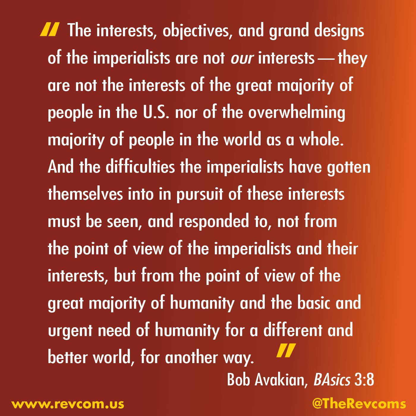 We can no longer afford to allow these imperialists to dominate the world and to determine the destiny of humanity. They need to be overthrown as quickly as possible. And it is a scientific fact that we do not have to live this way.