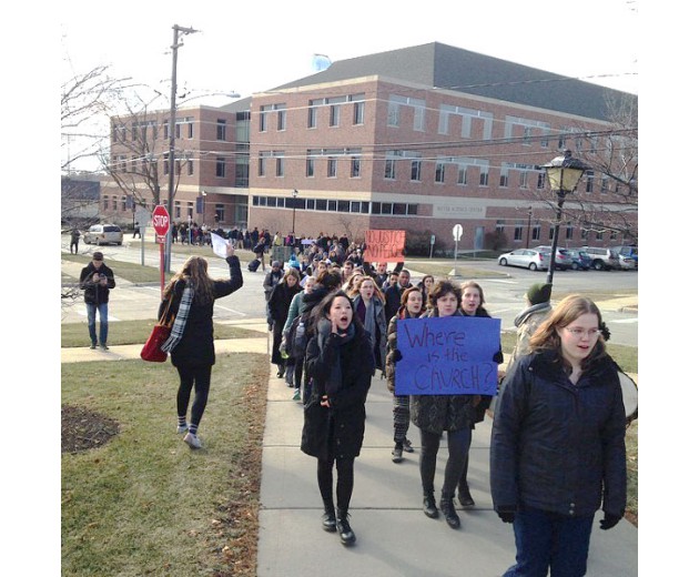 Students marched out of the classrooms at the evangelical Christian Wheaton College in Illinois carrying signs “No Justice No Peace.” They were led by a sign asking: “Where is the Church?”