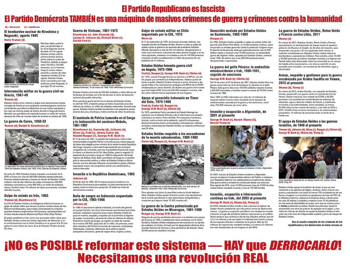 Muchas de estas acciones sanguinarias, y las terribles carnicerías y atrocidades que conllevaban, ocurrieron bajo administraciones demócratas: los demócratas, al igual que los republicanos, han perpetrado repetidamente monstruosos crímenes de guerra y crímenes contra la humanidad por la razón básica de que ambos partidos son instrumentos de la clase dominante de este sistema del capitalismo-imperialismo.