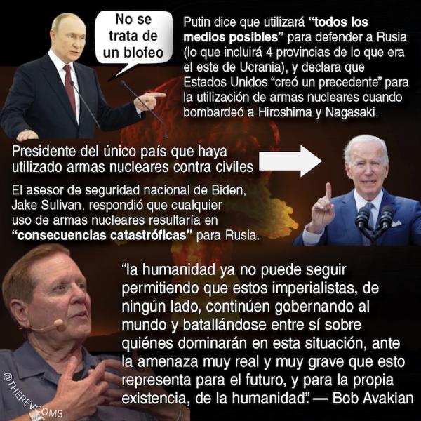 La amenaza de una guerra nuclear —de una tercera guerra mundial— es real, y crecen las probabilidades cada día que pase. La semana pasada escribimos: “La guerra en Ucrania ha escalado a una nueva y peligrosa fase. El peligro de un intercambio nuclear es más grande y lo han expresado más explícitamente que nunca los líderes políticos de ambos bandos de la guerra: Rusia, por un lado, y Ucrania, por el otro, respaldada por Estados Unidos y la OTAN”.