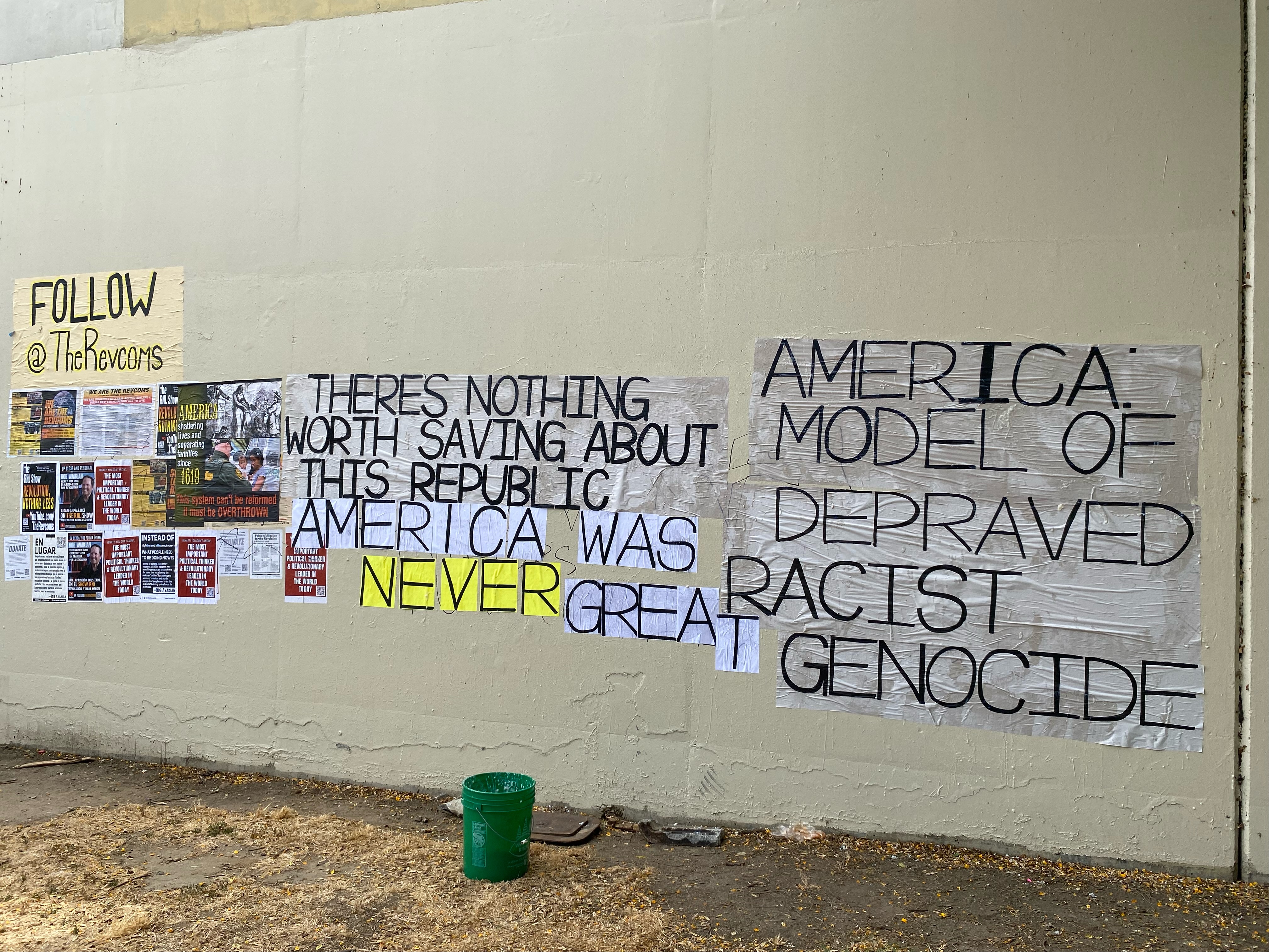 La batalla por los muros continúa en Sur Centro angelino. Un muro con el mensaje revolucionario se tapó con mensajes reaccionarios como “traidores”, “que se jodan los comunistas”, “Viva la república” y “Putos” en letras grandes. Los revcom volvieron con una respuesta: “Estados Unidos: modelo de genocidio racista depravado. No hay nada que valga la pena salvar de esta república” y “Estados Unidos NUNCA ha tenido grandeza”. Cuando fuimos a responderle a este fascista, algunas personas que vieron el agitado intercambio en el muro, se alegraron de vernos de regreso y preguntaron si estábamos ahí para tapar lo que se había escrito.