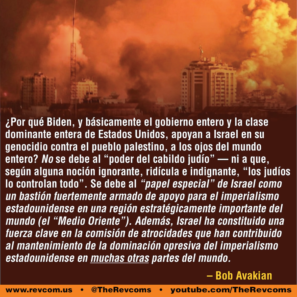 ¿Por qué Biden, y básicamente el gobierno entero y la clase dominante entera de Estados Unidos, apoyan a Israel en su genocidio contra el pueblo palestino, a los ojos del mundo entero? No se debe al “poder del cabildo judío” — ni a que, según alguna noción ignorante, ridícula e indignante, “los judíos lo controlan todo”. Se debe al “papel especial” de Israel como un bastión fuertemente armado de apoyo para el imperialismo estadounidense en una región estratégicamente importante del mundo (el “Medio Oriente”). Además, Israel ha constituido una fuerza clave en la comisión de atrocidades que han contribuido al mantenimiento de la dominación opresiva del imperialismo estadounidense en muchas otras partes del mundo.