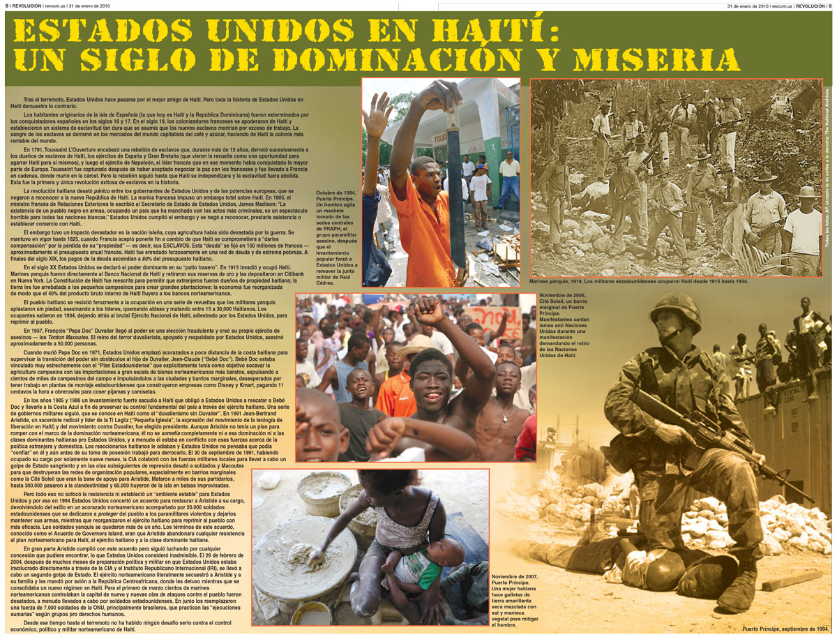 Todo observador honesto y conocedor sabe que la terrible situación en Haití es abrumadoramente responsabilidad del imperialismo estadounidense, el cual ha dominado a Haití durante más de 100 años. (Estados Unidos desplazó, pero también siguió los pasos del colonialismo-imperialismo francés, el cual esclavizó abiertamente a los haitianos durante más de 100 años. La enorme riqueza extraída de las plantaciones de esclavos de Francia en Haití ayudó a sentar las bases del “modo de vida civilizado” de Francia, mientras condenaba al pueblo haitiano a una vida corta de miseria y muerte brutal por exceso de trabajo, enfermedades o asesinato directo — ¡la esperanza de vida de un esclavo haitiano era de 21 años! (Vea “Haití: un largo descenso al infierno”).