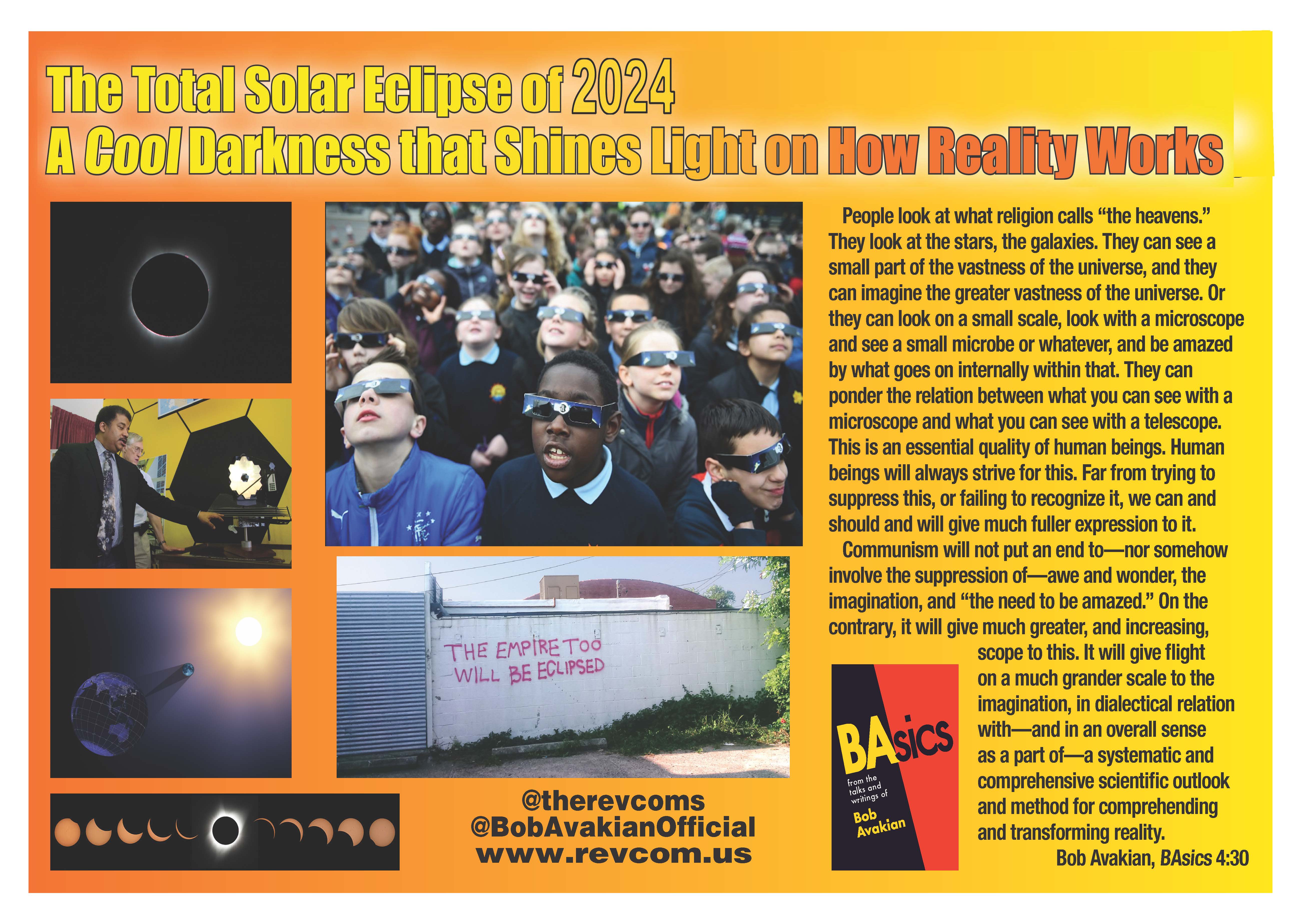 Buscamos en Google el eclipse solar de 2017 y encontramos el impresionante cartel que revcom.us había publicado en aquel entonces (y había actualizado para el eclipse de 2024), además de la hermosa carta de un miembro del Club Revolución de Chicago que lo presenció. Inspirados también por la cita de Bob Avakian de Lo BAsico 4:30, nos lanzamos a invitar a la gente.